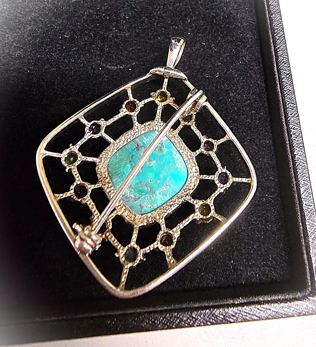 Ciondolo in argento con turchese e quarzi, utilizzabile anche come spilla
