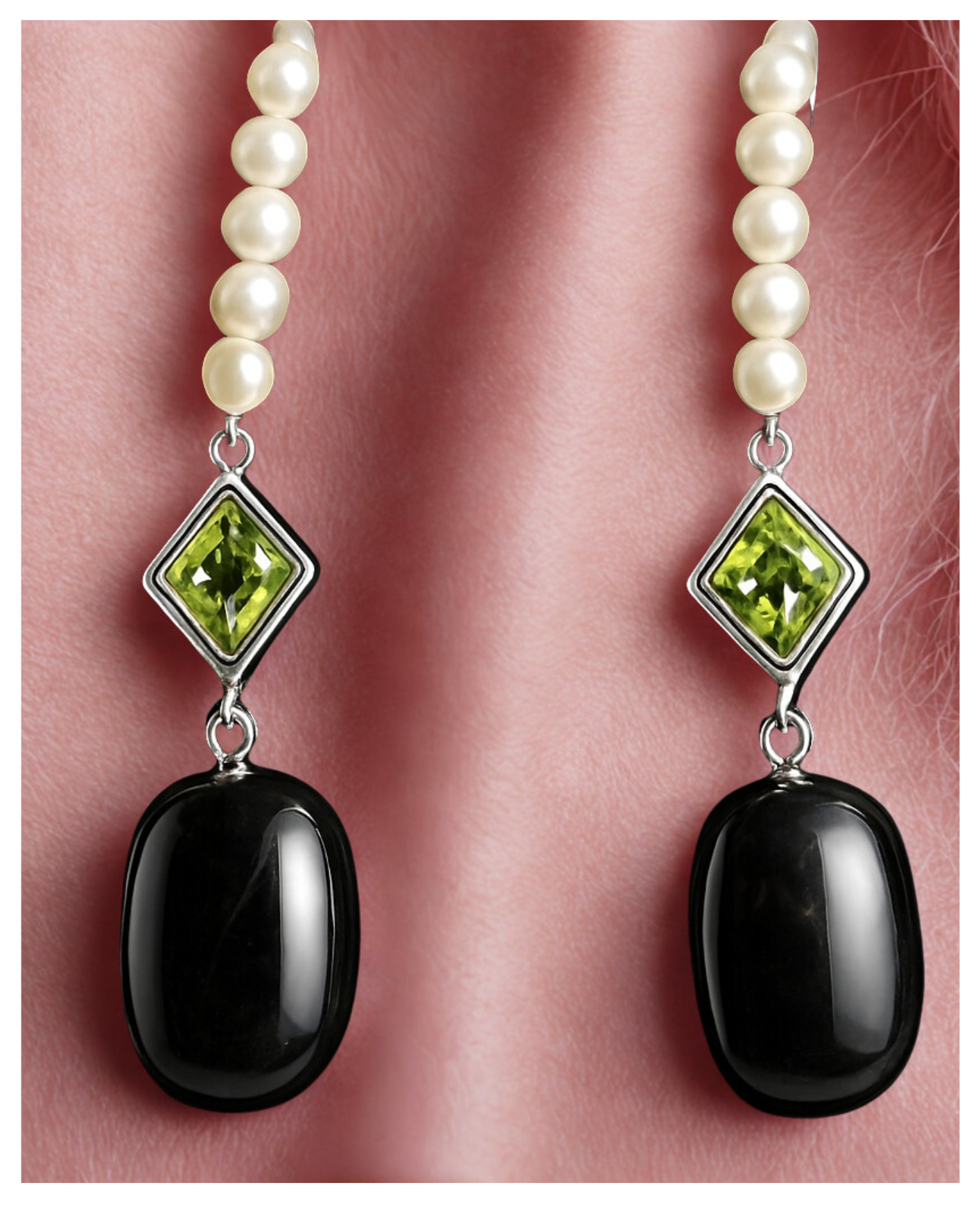 orecchini in argento con onice nero, peridoti e perle
